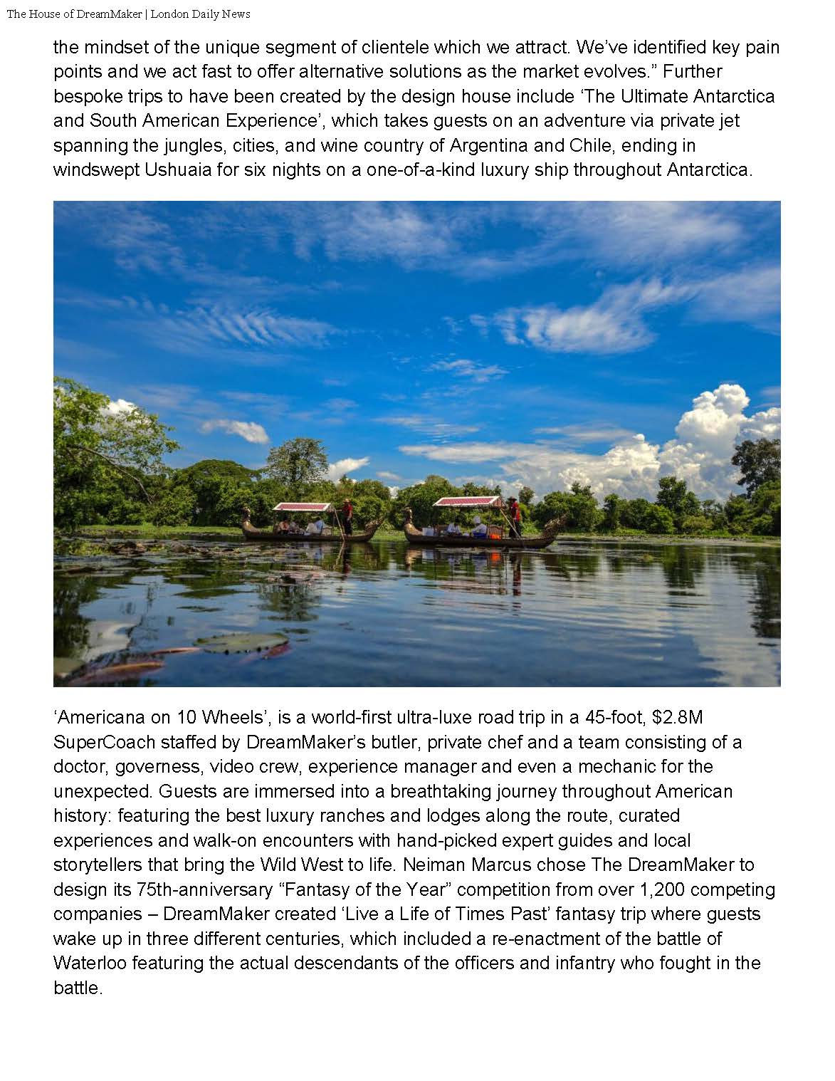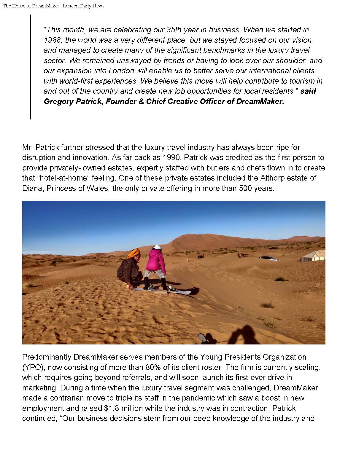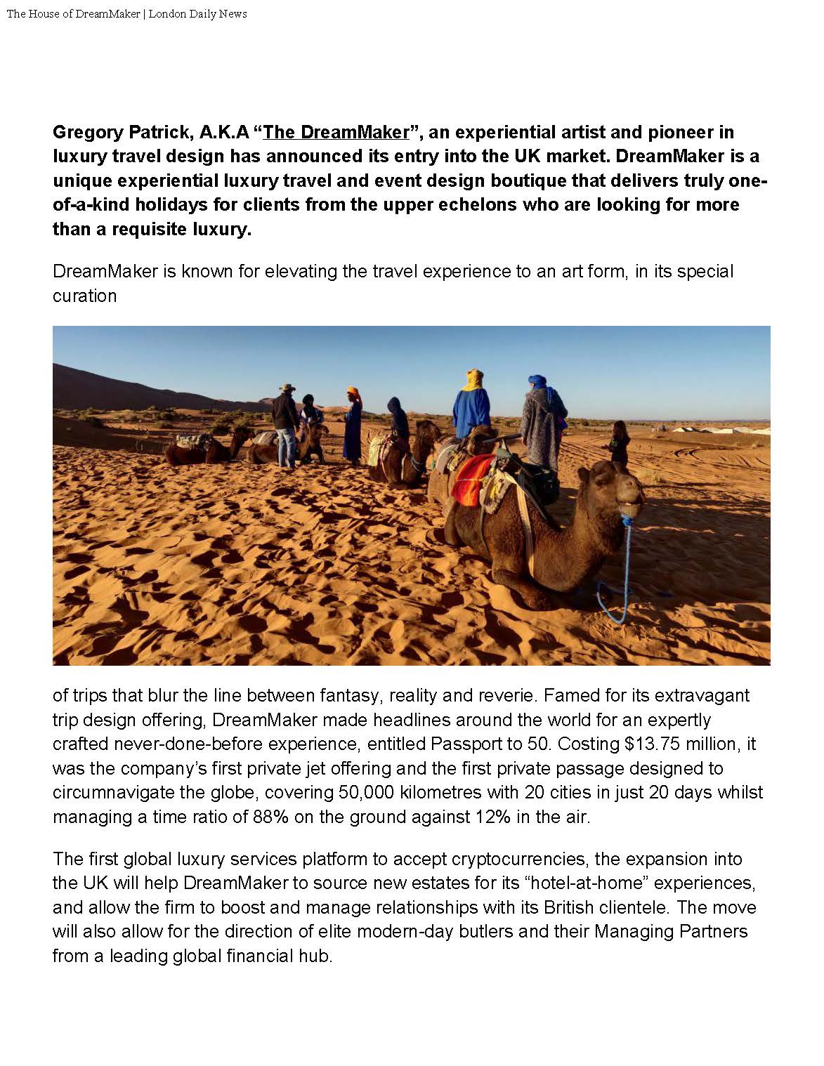 “This month, we are celebrating our 35th year in business. When we started in 1988, the world was a very different place, but we stayed focused on our vision and managed to create many of the significant benchmarks in the luxury travel sector. We remained unswayed by trends or having to look over our shoulder, and our expansion into London will enable us to better serve our international clients with world-first experiences. We believe this move will help contribute to tourism in and out of the country and create new job opportunities for local residents.” said Gregory Patrick, Founder & Chief Creative Officer of DreamMaker.